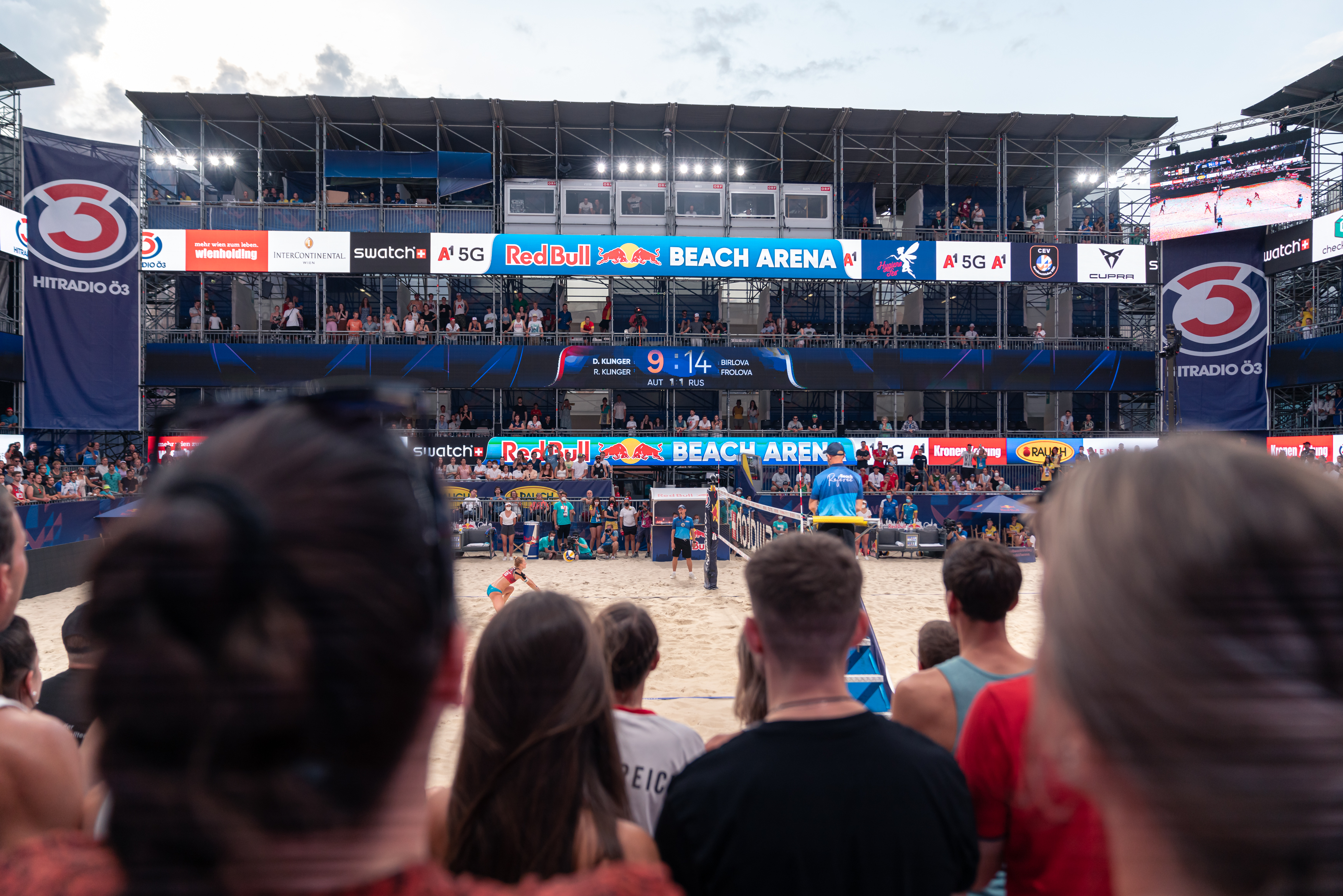 Due to the pandemic Eurobeachvolley is being held in a different location in the centre of Vienna, The Sandbox only holds 2,000, a modest venue by Vienna and Austria’s standards but the feeling is the same. The high stands tower over the court and impose themselves over the playing arena and the players. The crowd ‘ooh and ahh’ every touch, ‘power block’ every kill block, and they even sing along to the Friends theme song with out a care of bother in the world.